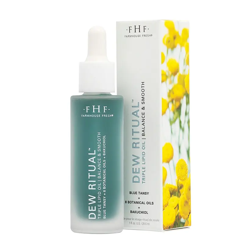 This luxurious, triple lipid formula visibly soothes with pure blue tansy essential oil, hydrates & nourishes with 8 botanical oils, and visibly reduces the look of fine lines with bakuchiol & vitamin C. Dew Ritual® ensures a beautifully revitalized complexion with a lightweight, fast-absorbing glow – perfect for all skin types! The natural, pure blue tansy floral essential oil scent is soft and romantic.